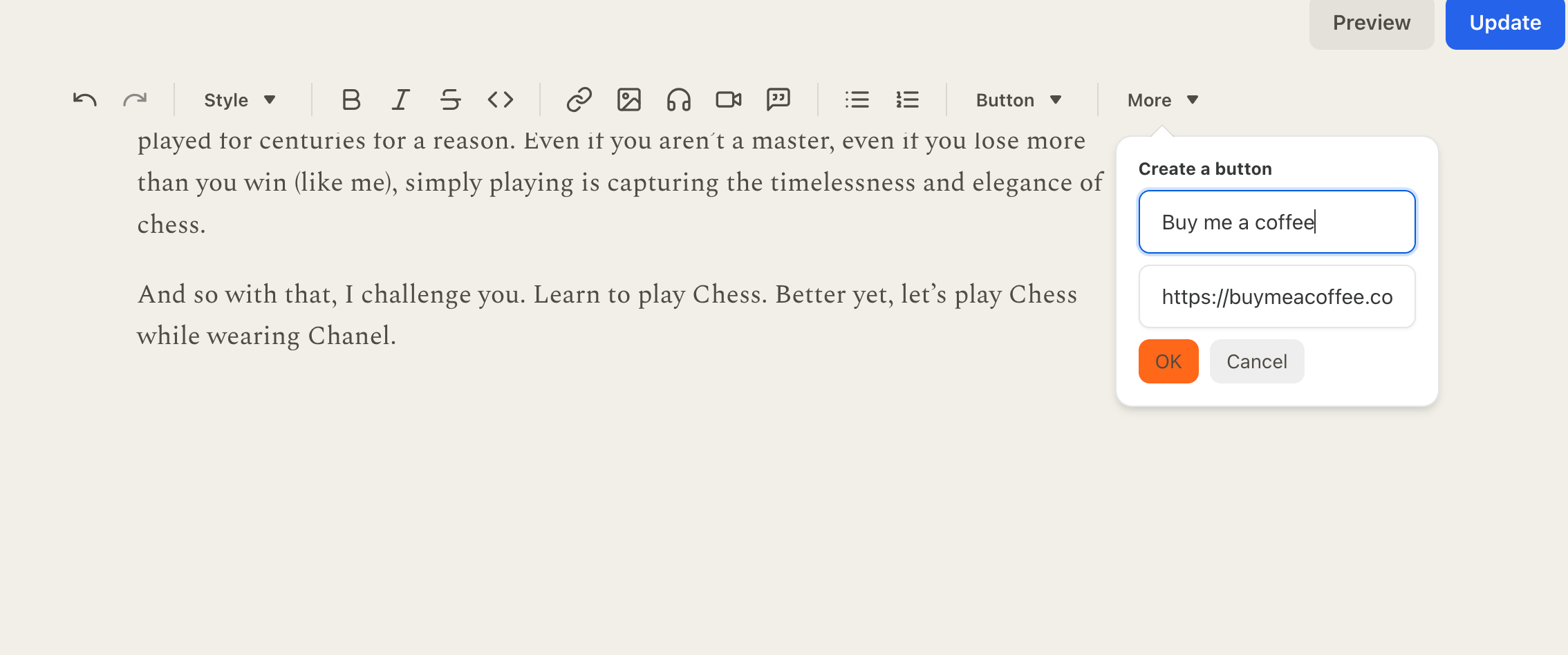 Here’s how I added the “Buy Me a Coffee” button. Also heads up, I am in no way affiliated with Buy Me a Coffee and this is actually my first time using it.